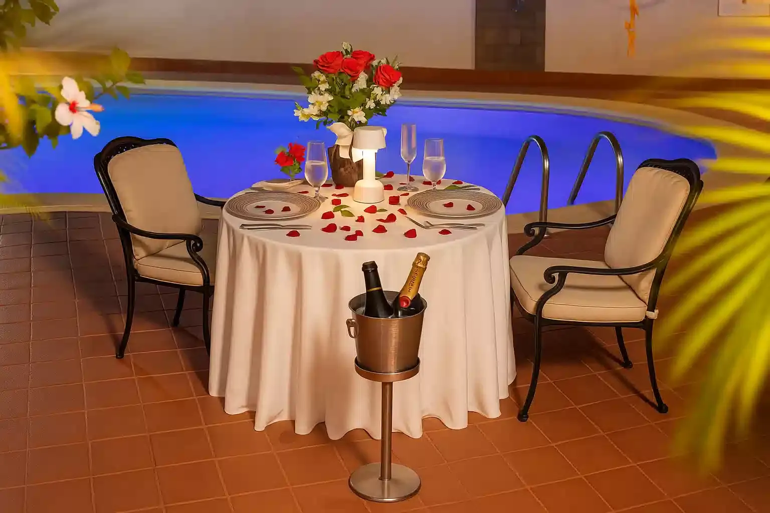 Dine under the stars by our serene swimming pool, where elegance meets tranquility. Whether it's a romantic dinner for two or a special gathering, our intimate poolside setting offers a magical ambiance, complemented by exquisite cuisine and impeccable service for an unforgettable dining experience.