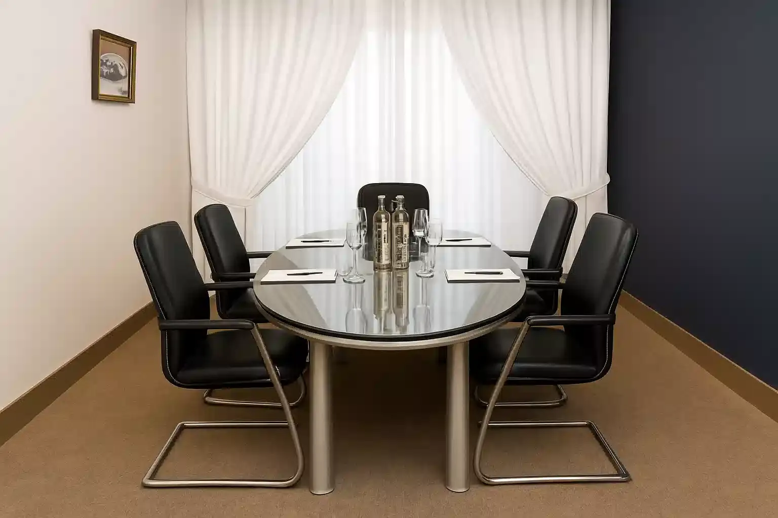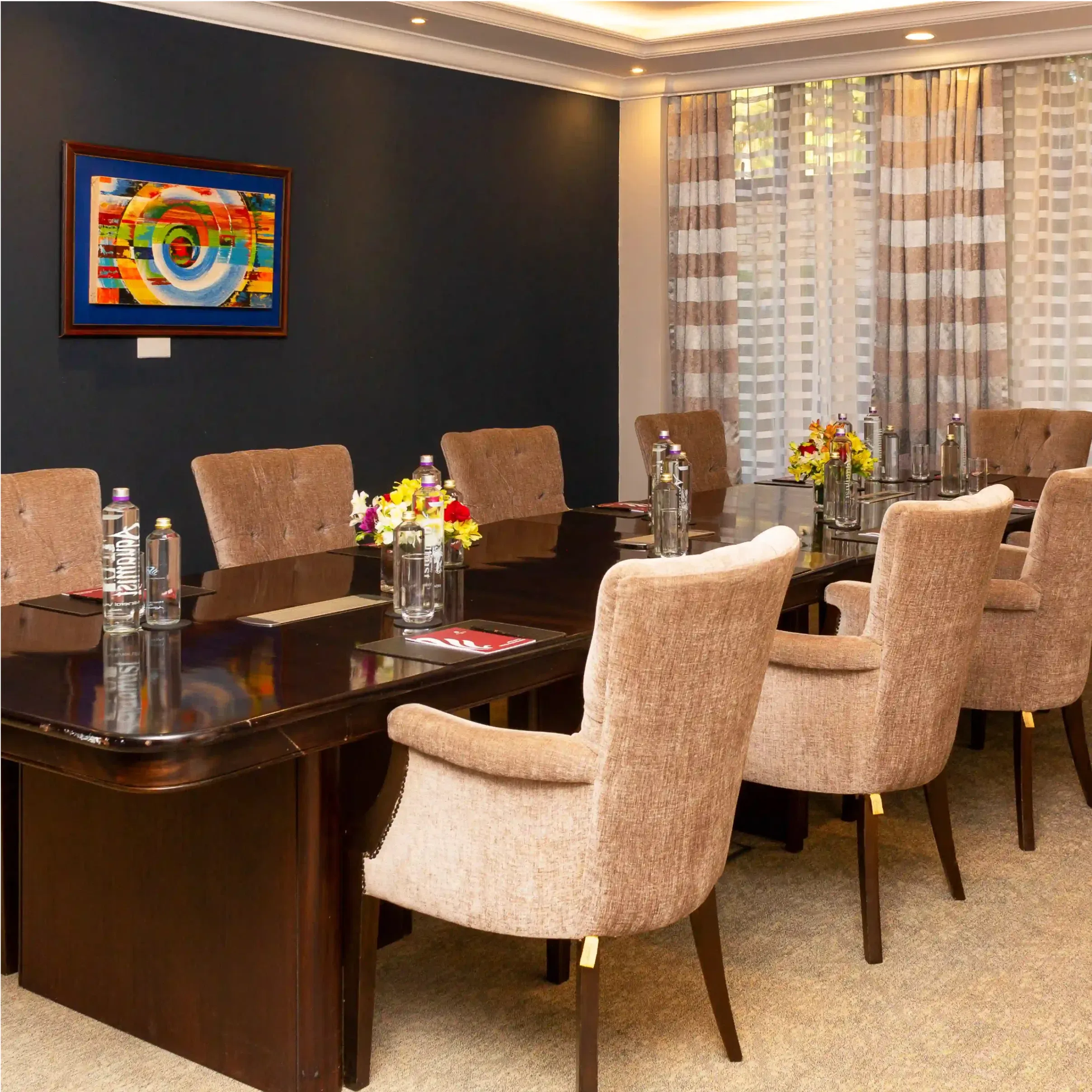 Step into an atmosphere of refined professionalism in our stylish small meeting room. Designed for impactful discussions and seamless collaboration, this intimate yet sophisticated space features a sleek conference table, ergonomic seating, and elegant décor. With thoughtful details like bottled water, notepads, and fresh floral accents, every meeting here is set for success