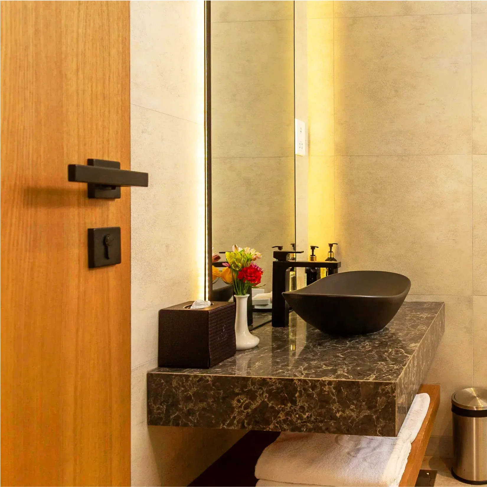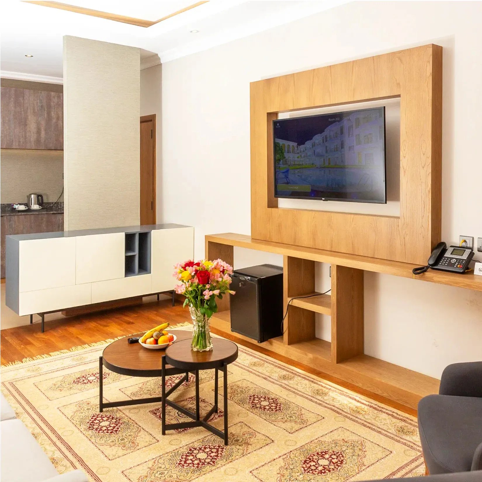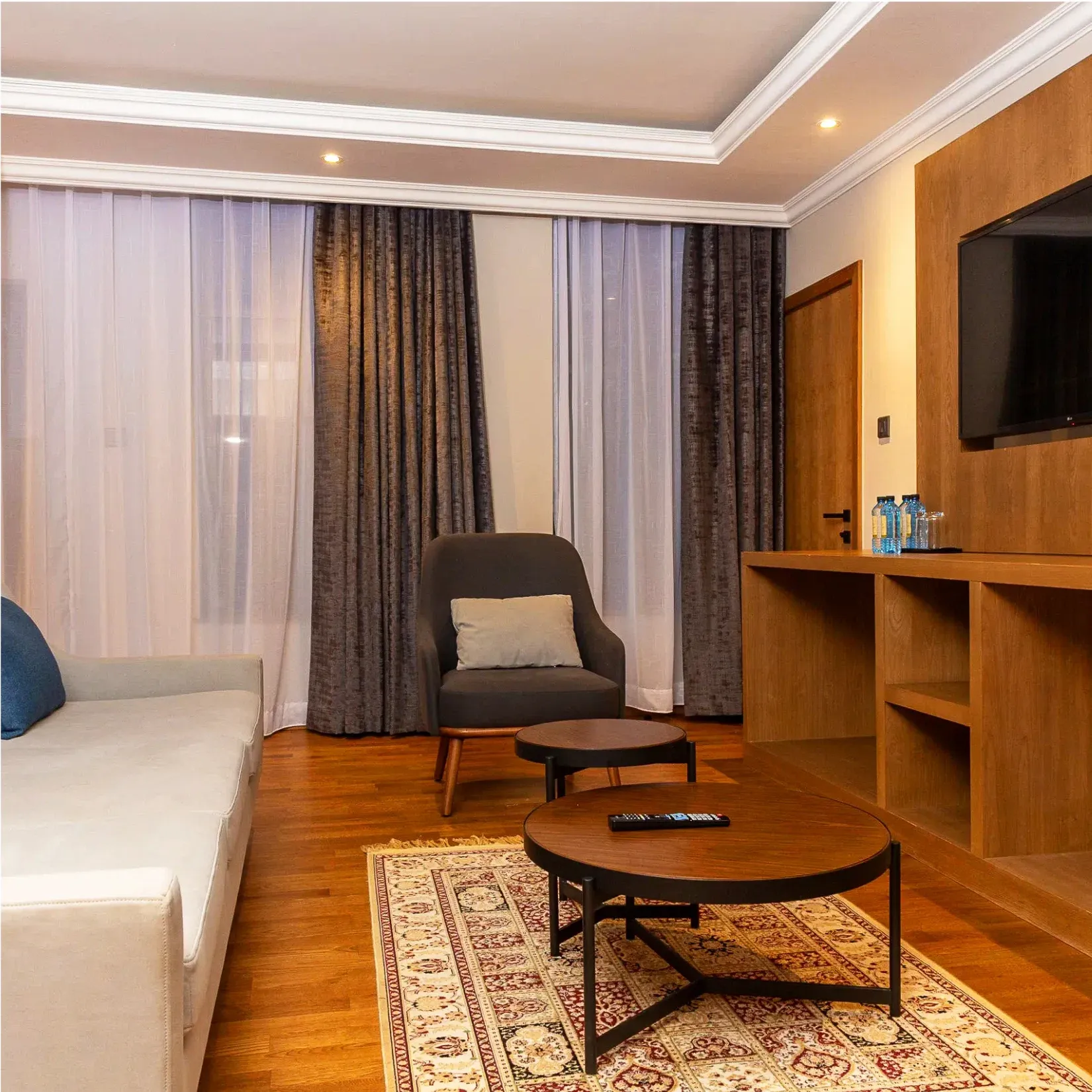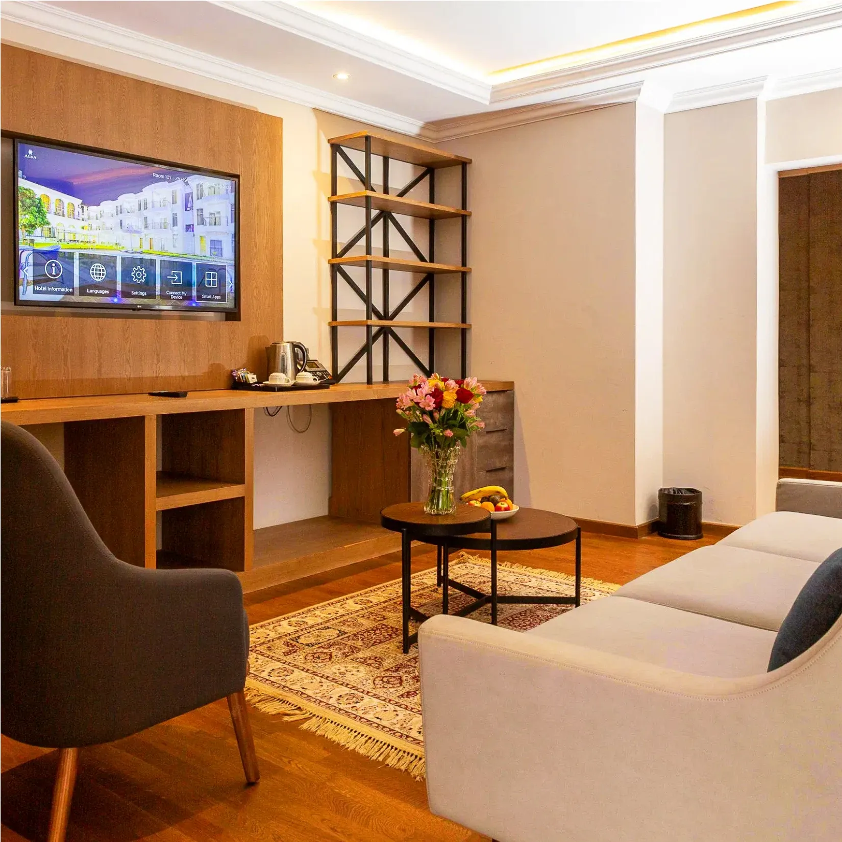 Fitted with state of the art entertainment centre to receive your guests away from serenity of the bedroom. We value privacy and we're ready to serve from the comfort of your room.